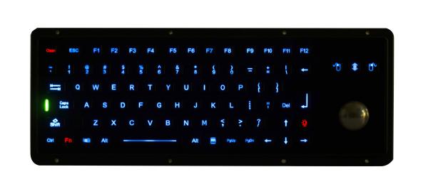 DESCRIPTION: 85 keys IP65 dynamic vandal proof industrial and military keyboard with adjustable industrial backlight and IP68 dynamic washable 38mm stainless steel optical trackball module with 800 DPI resolutions for fast and accurate cursor position, with FN (F1, F2, F3, F4, F5, F6, F7, F8, F9, F10, F11, F12) on the top line for easy operation, with industrial PCB with carbon-on-gold key switch technology with key stroke 1.50mm with extremely good tactile feeling for fast and accurate input without any noise, red clean key lock/disable the keyboard for easy cleaning and washing without needing to take out the keyboard from PC, rear panel mounted. Black titanium electroplated included.
